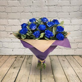 A timeless classic, 12 beautiful large headed blue roses, finished off with greenery, wrapped in craft paper and tied with a lace bow.